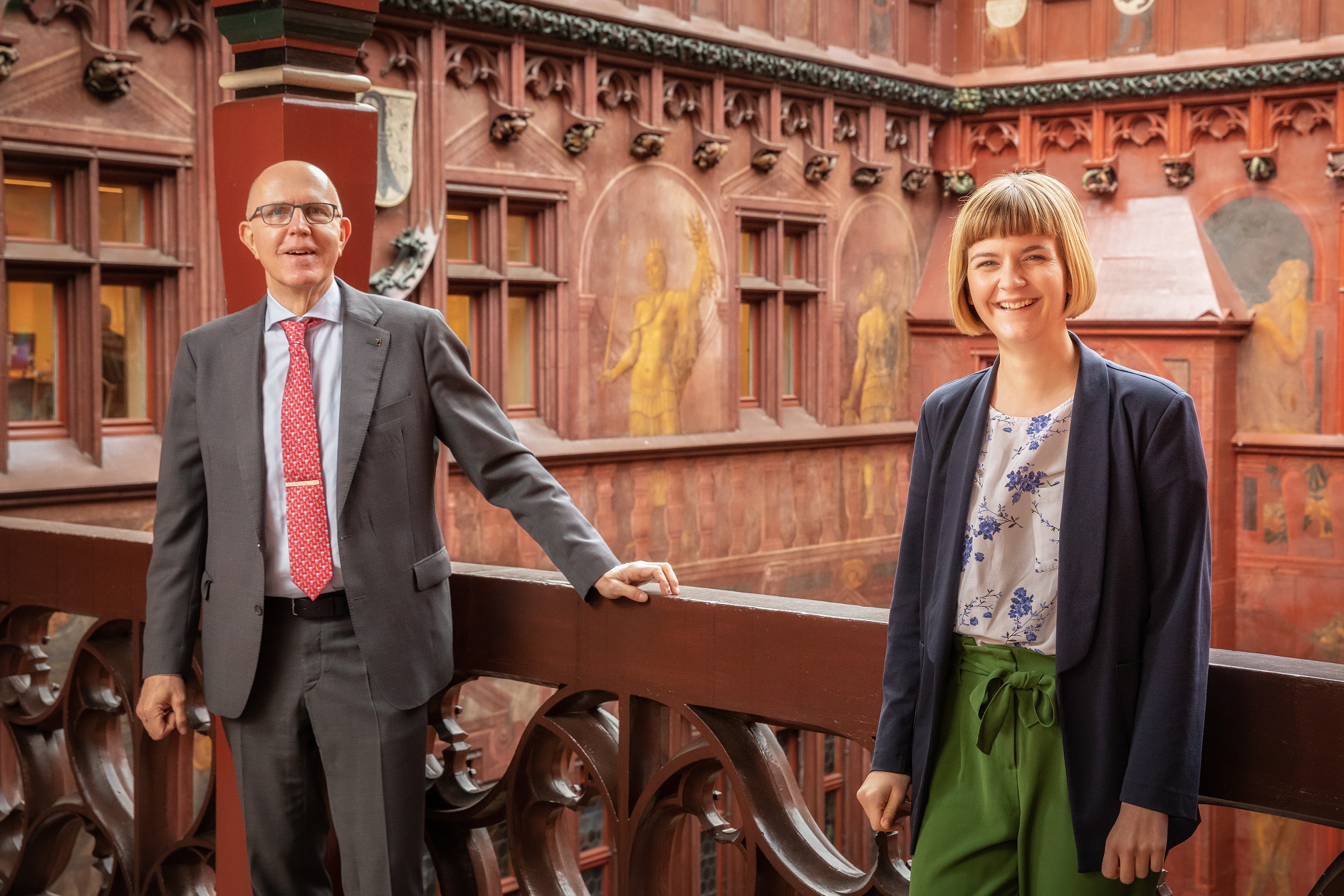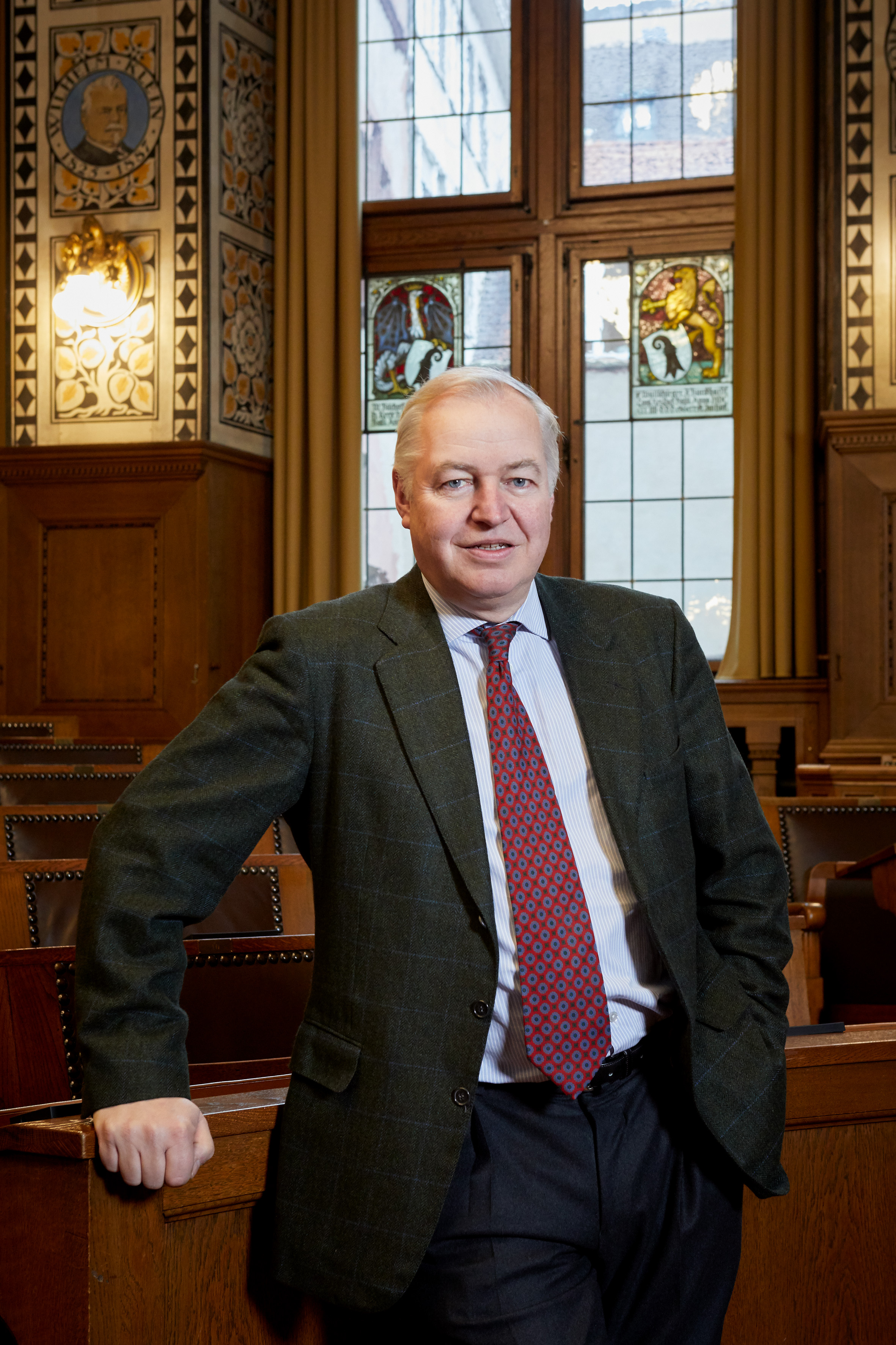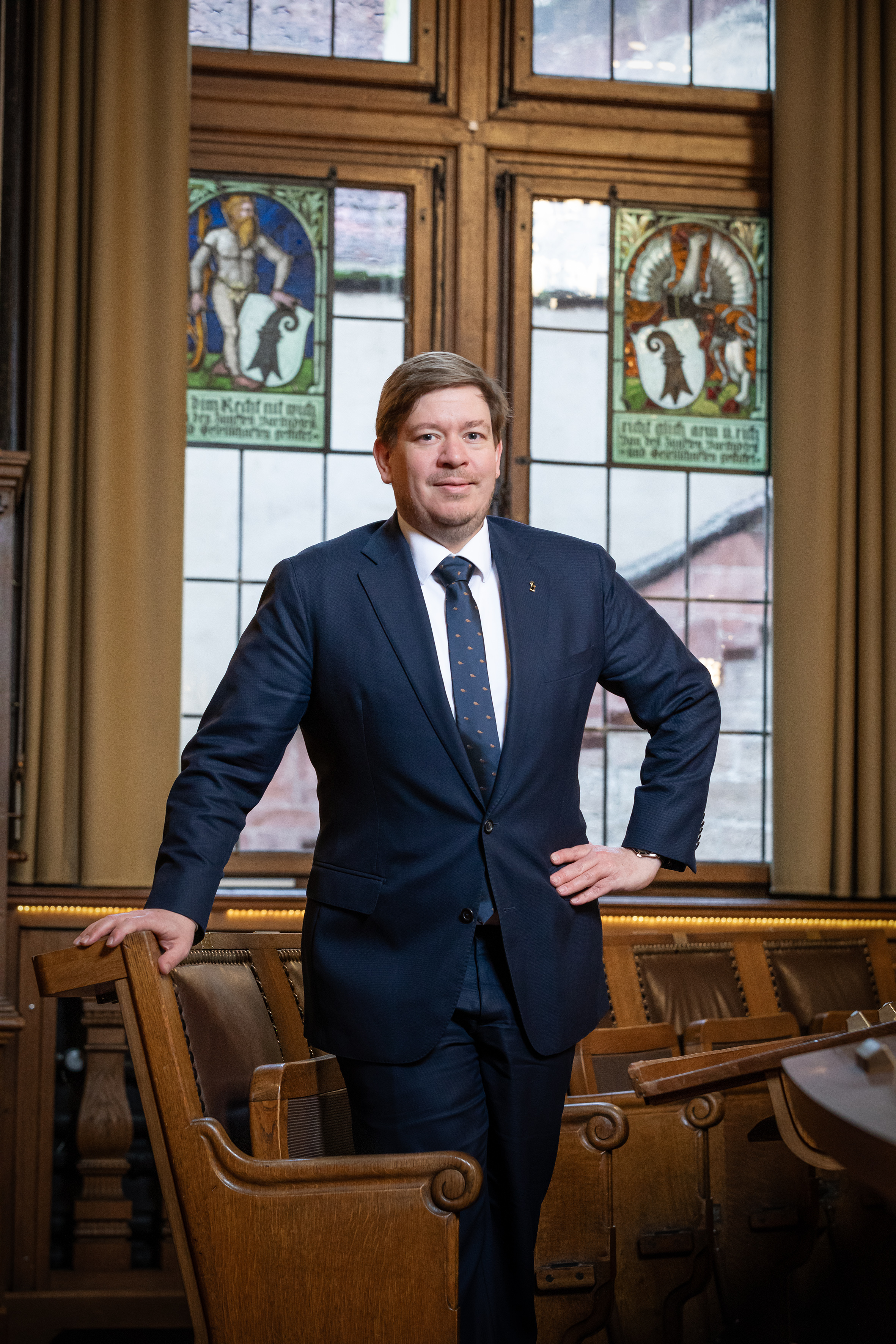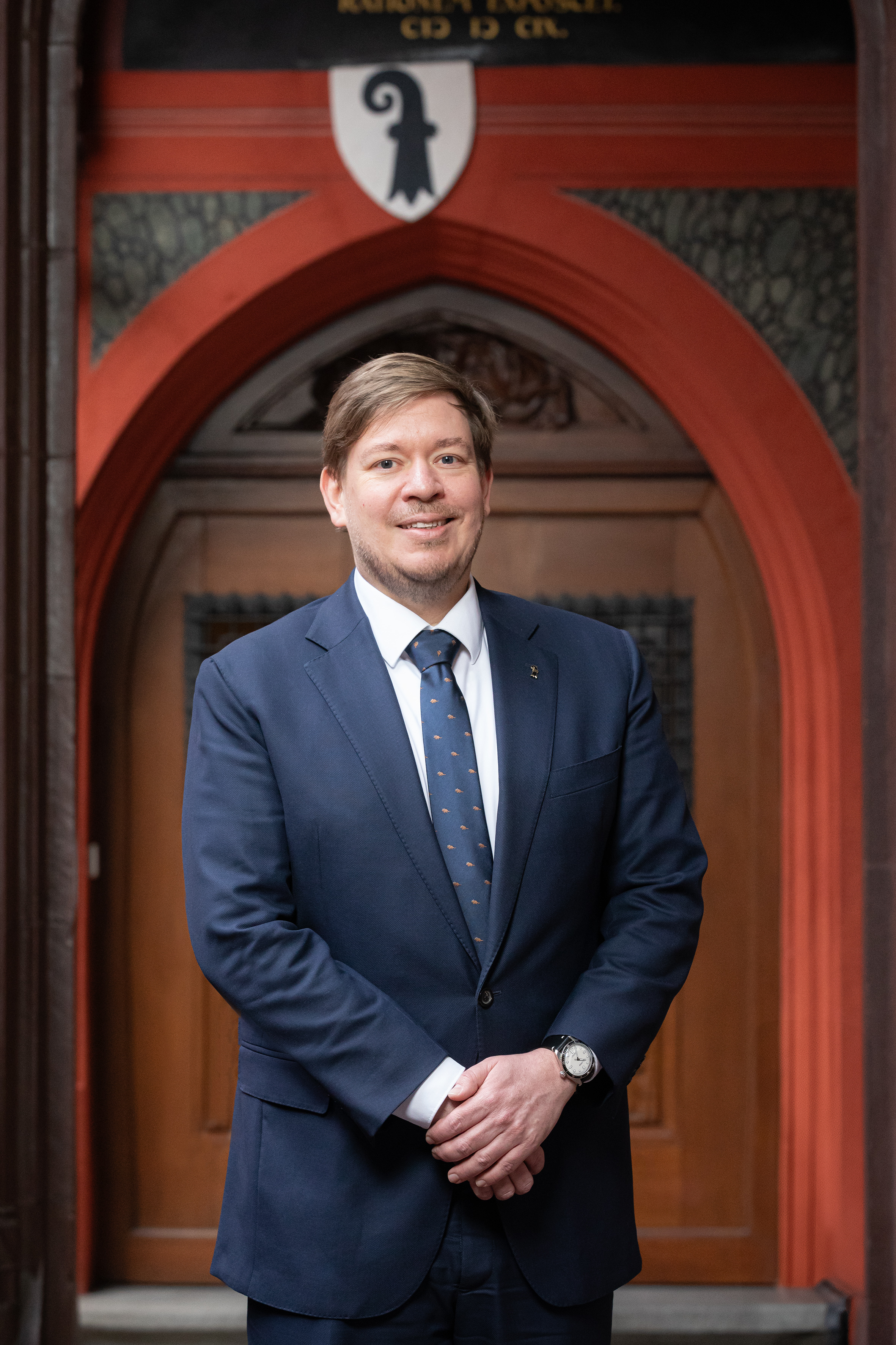 Balz Herter, Grossratspräsident 2025, vor dem Eingang ins Rathaus. Hochformat