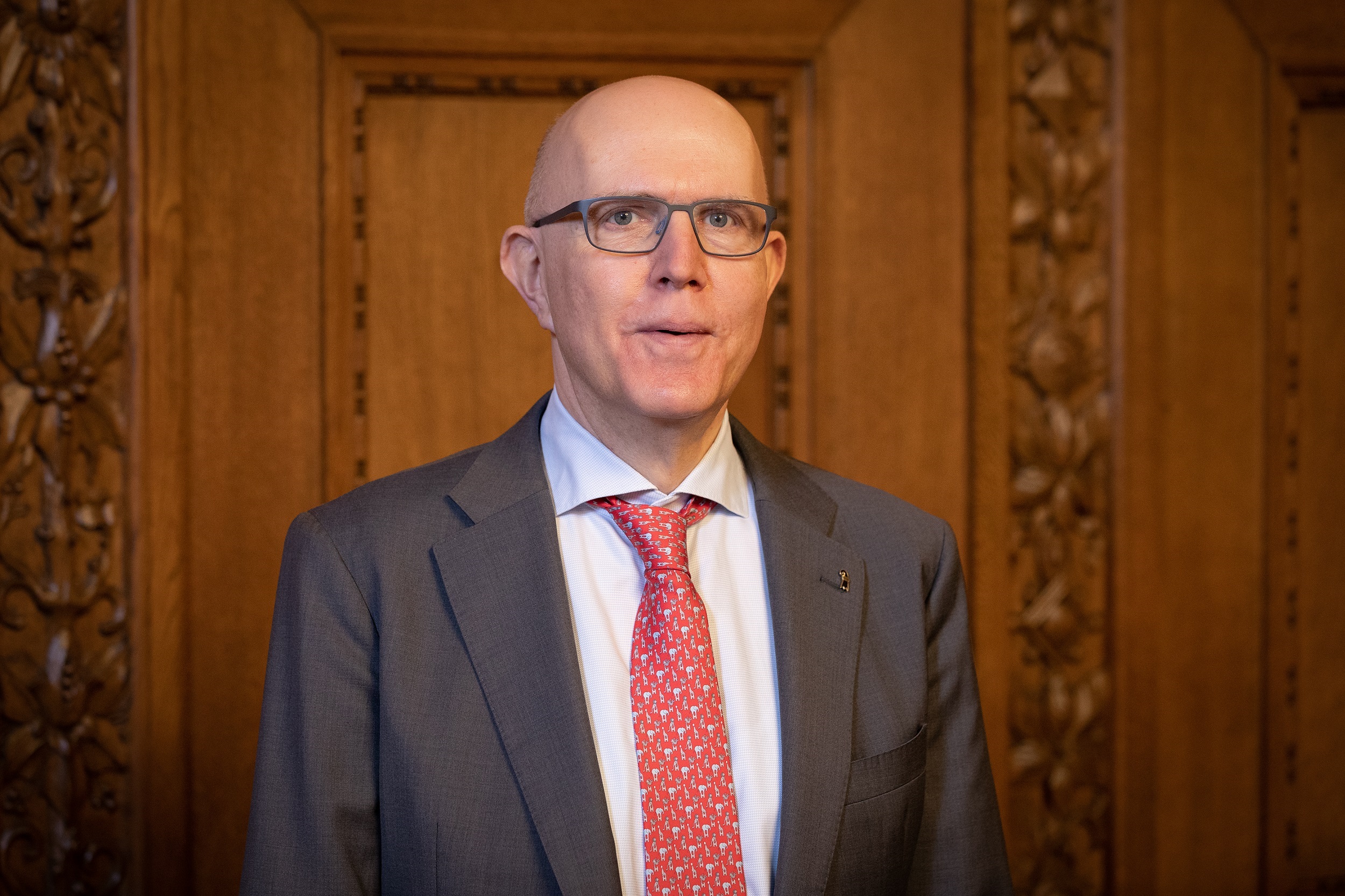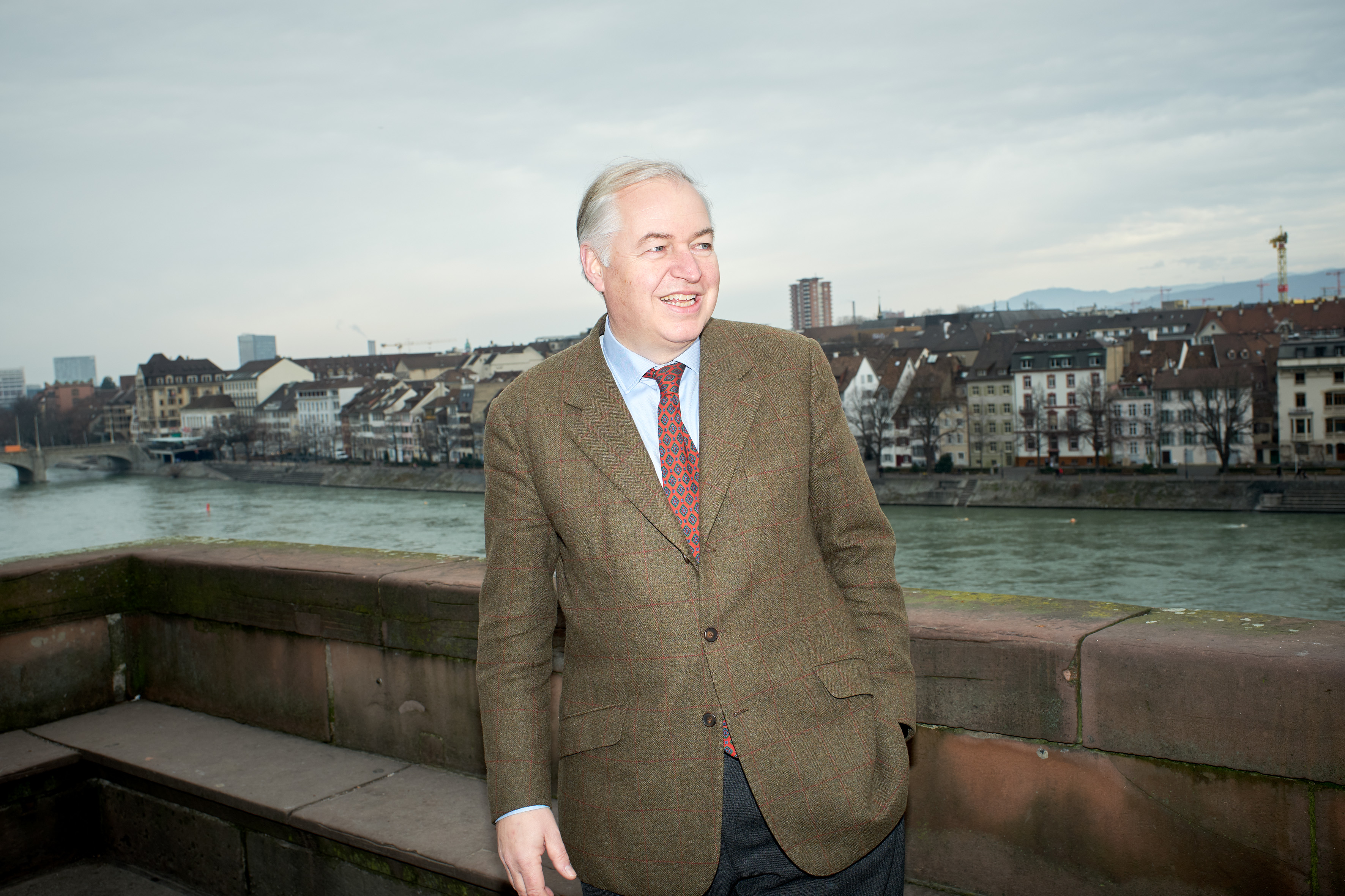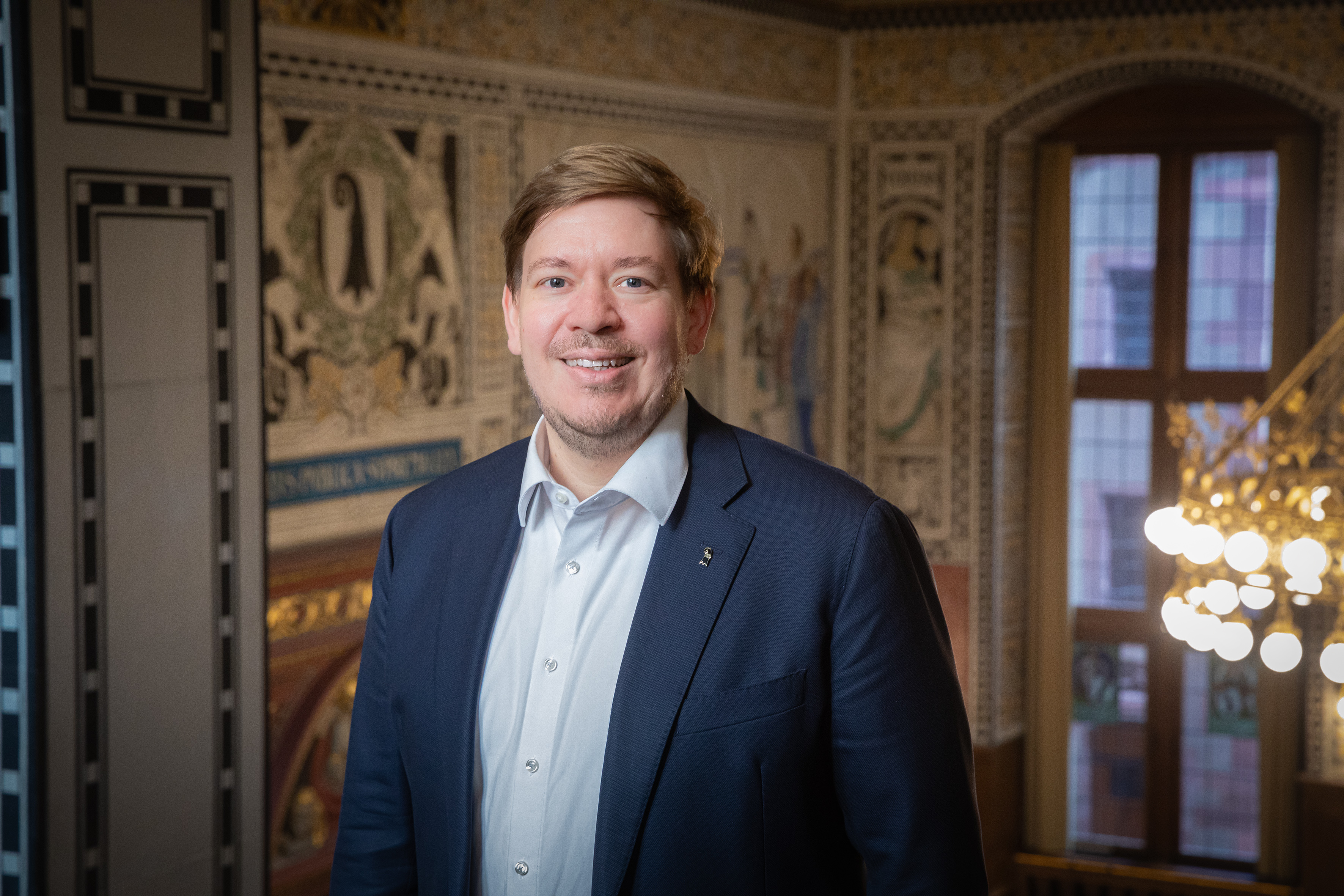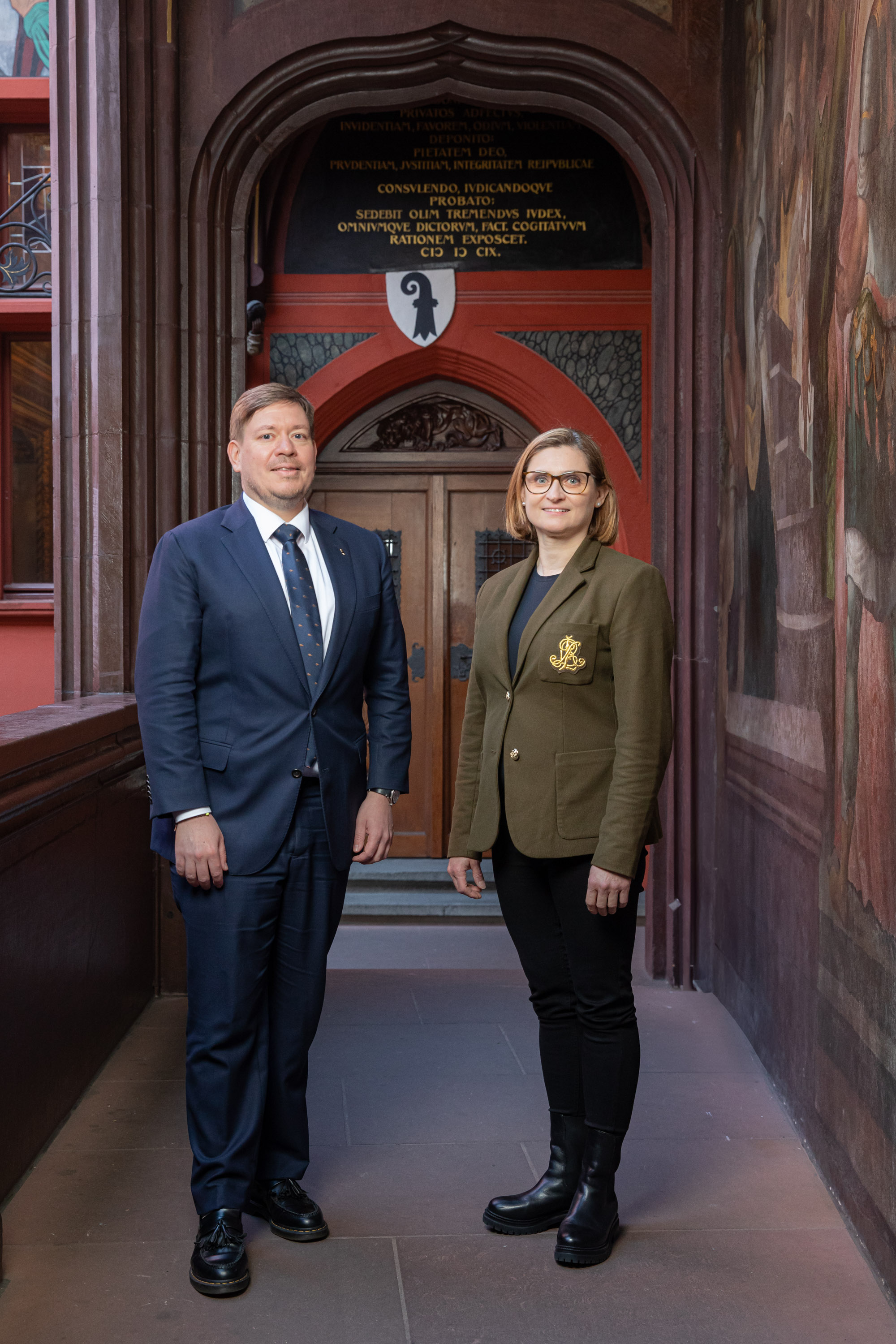Balz Herter, Grossratspräsident 2025, vor dem Eingang ins Rathaus. Hochformat